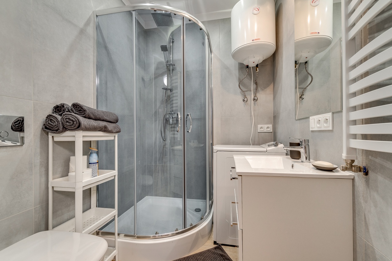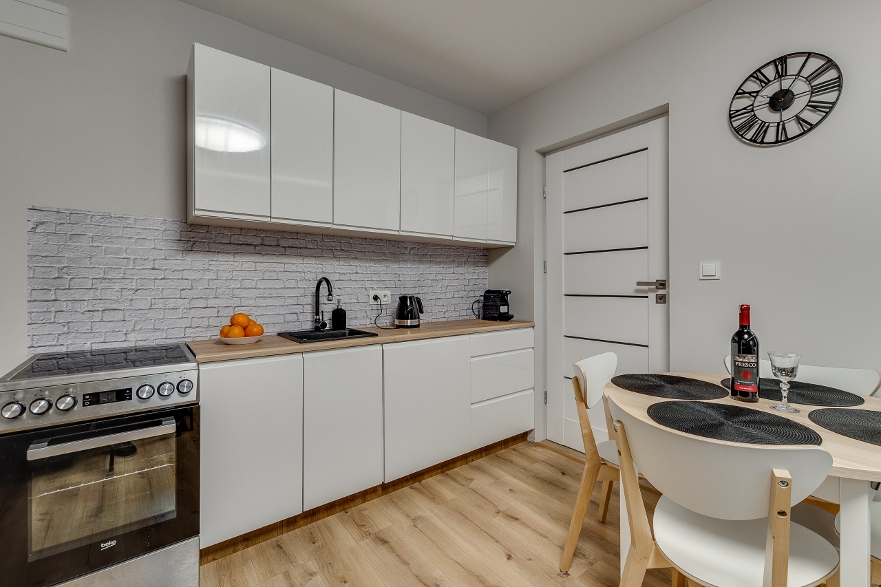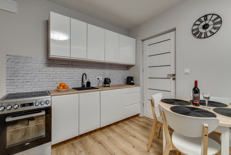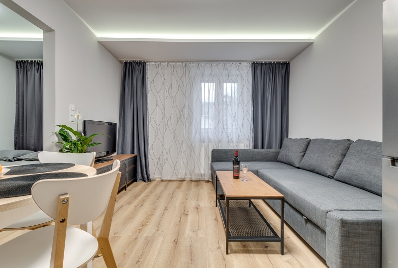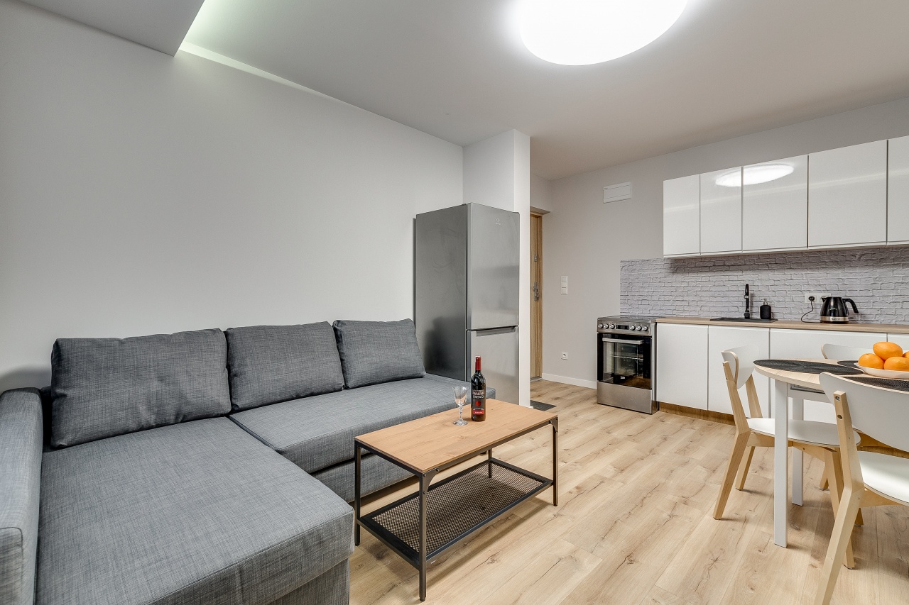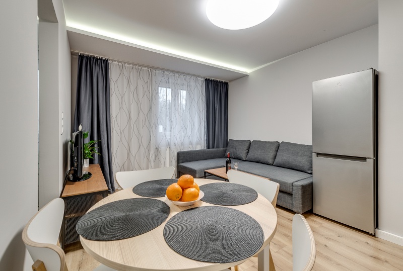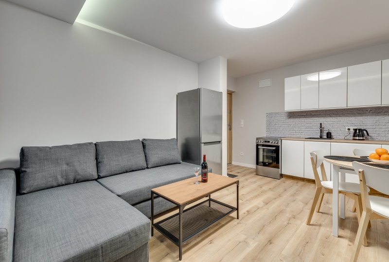 W tym komfortowym i przytulnym apartamencie znajduje się duży salon połączony wraz z aneksem kuchennym w którym znajduje się wszystko co potrzeba ( czajnik, piec wraz z piekarnikiem, kuchenka mikrofalowa lodówka, ekspres do kawy)prywatna łazienka wraz z pralką oraz jedna sypialnia, w której znajduje się podwójne łóżko oraz duża szafa. W salonie rozkładana sofą na której komfortowo odpoczną 2 osoby. Stół jadalniany dla 4 osób