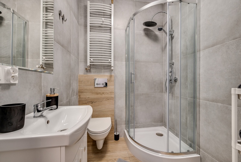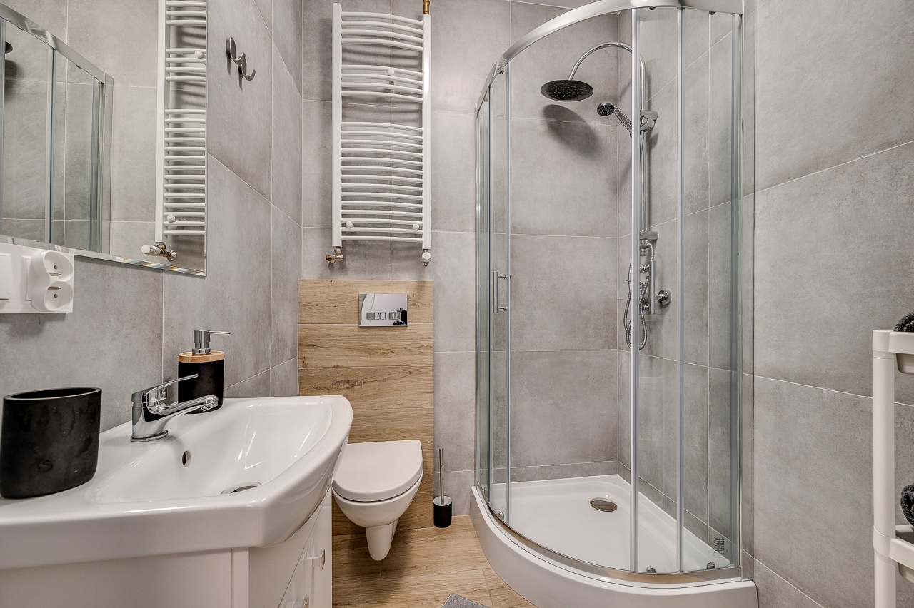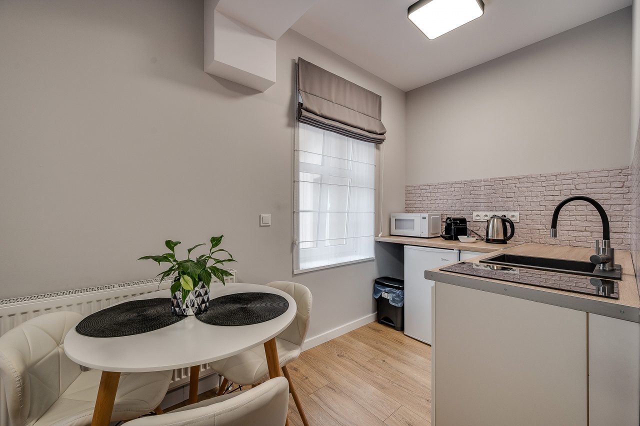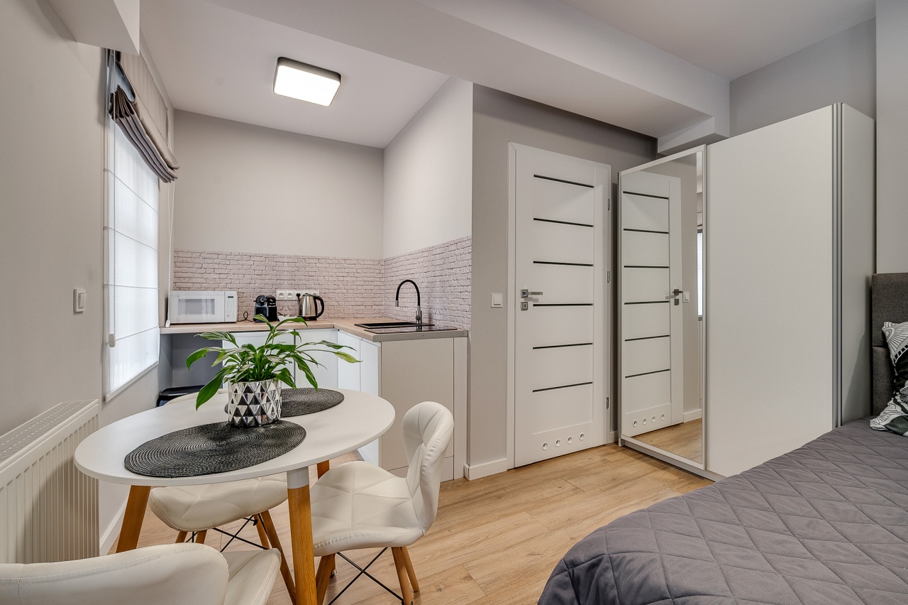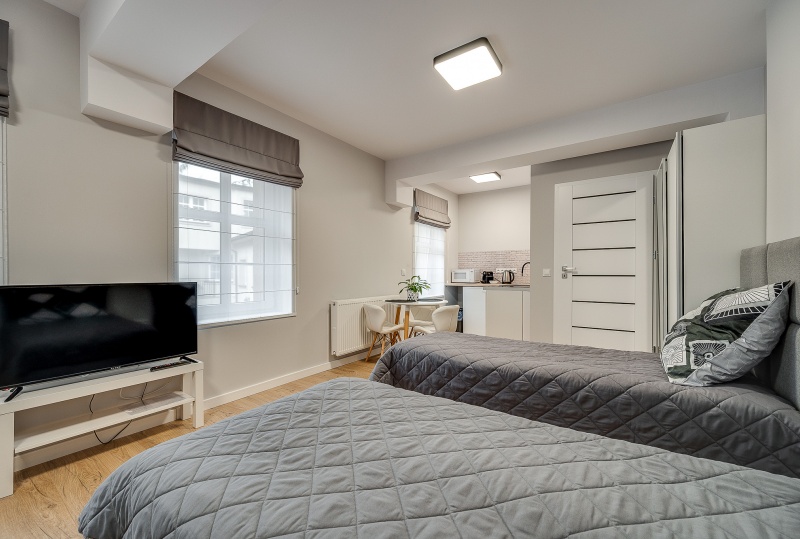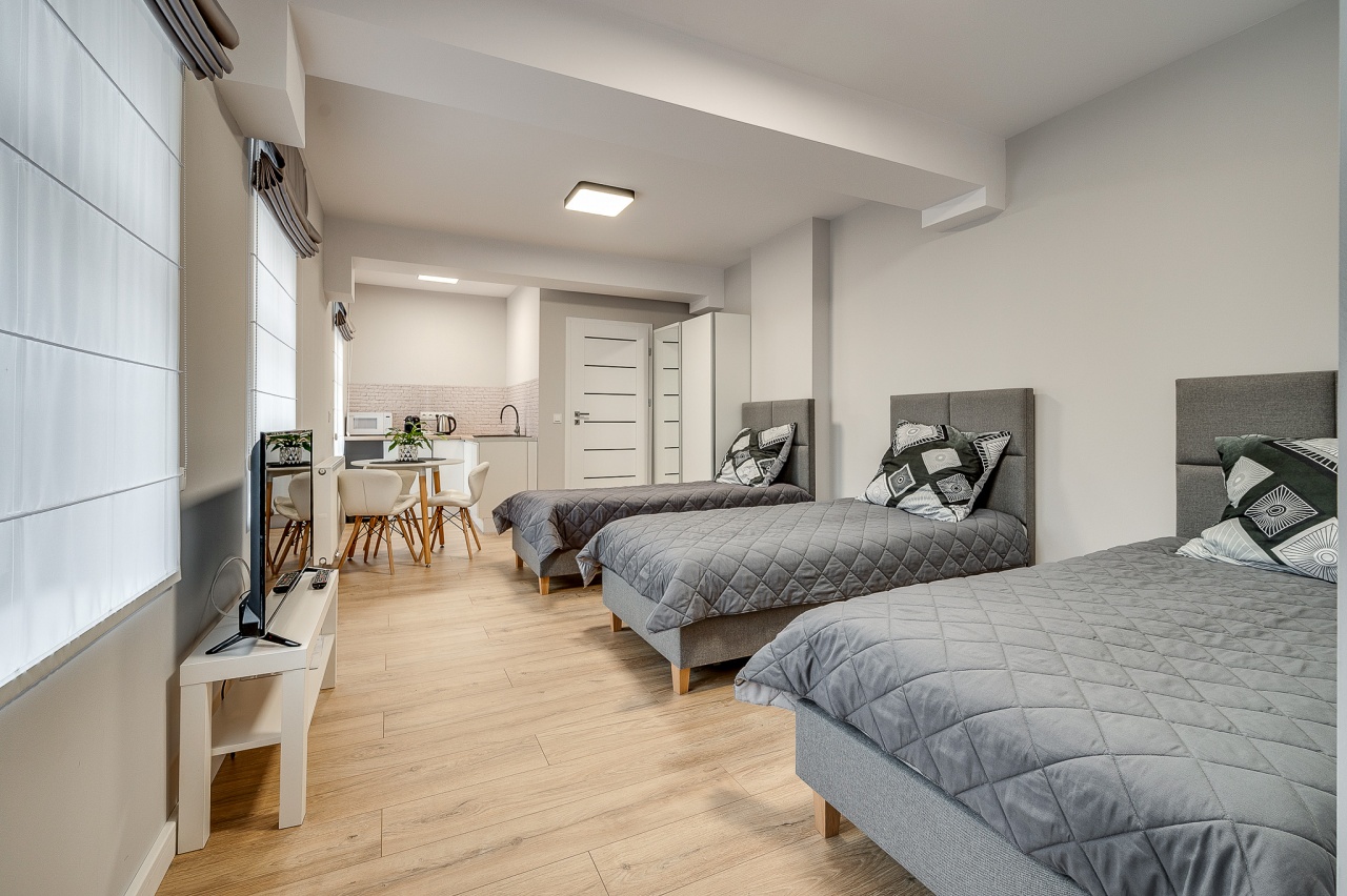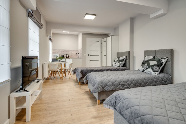 Apartament z wyposażonym aneksem kuchennym: czajnik, ekspres do kawy , lodówka, kuchenka mikrofalowa , talerze, szklanki, miski, sztućce itp. W apartamencie znajdują się trzy pojedyncze łóżka oraz przestronna szafa. Apartament posiada prywatna łazienkę z prysznicem , toaletą , pralką oraz suszarka do włosów. Do dyspozycji dla Naszych gości przygotowaliśmy komplet ręczników oraz smaczną kawę na czas pobytu