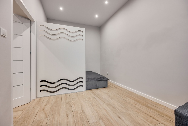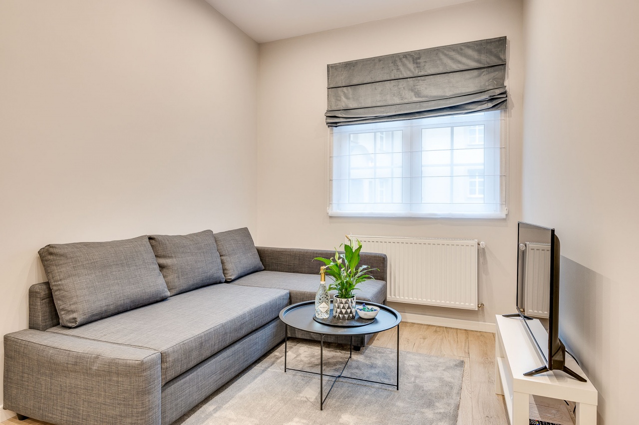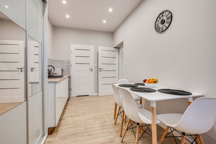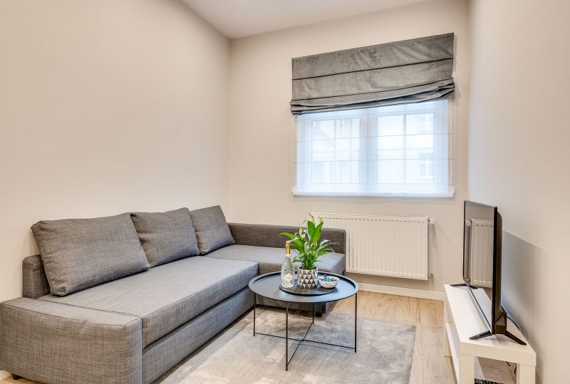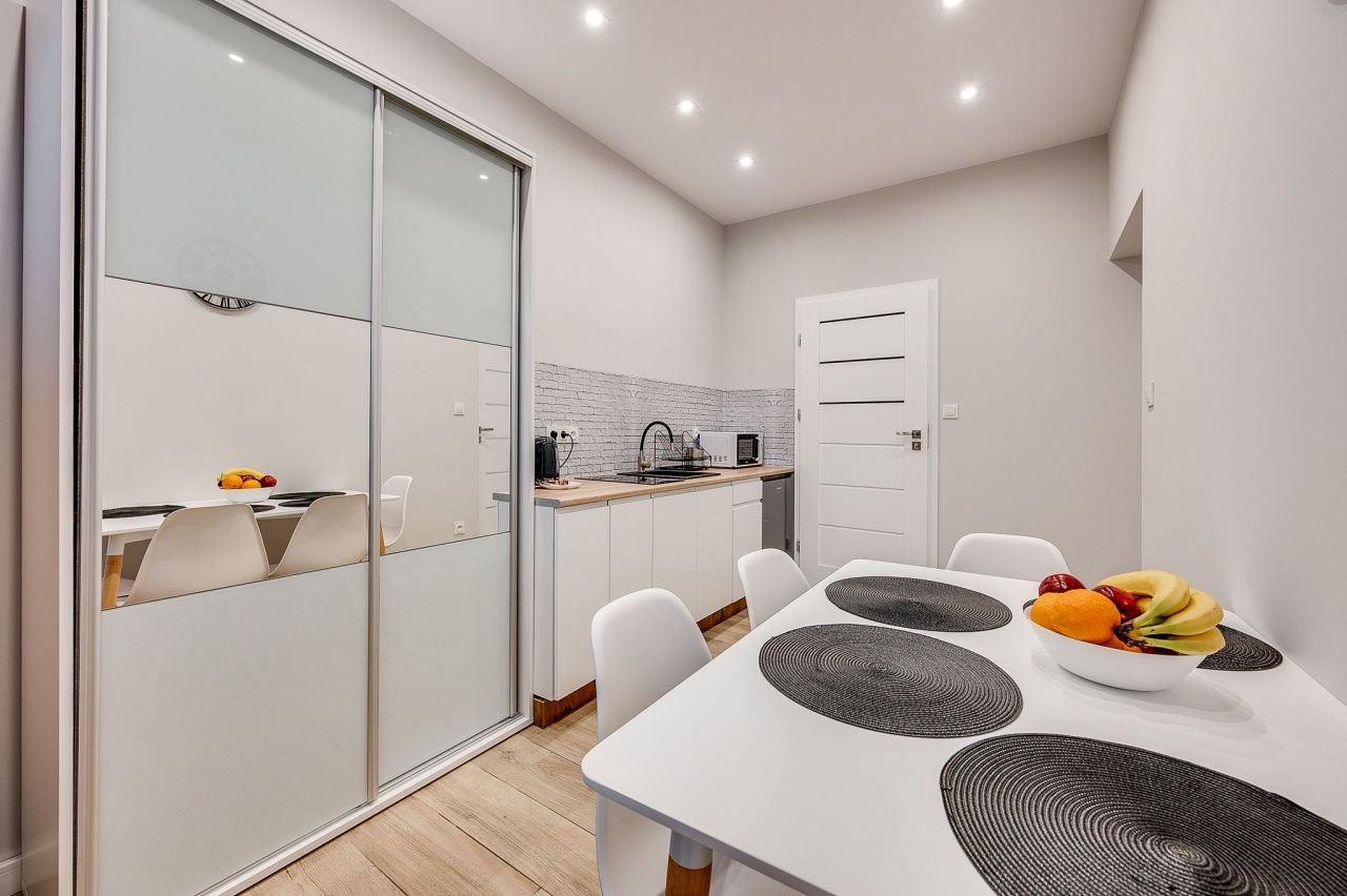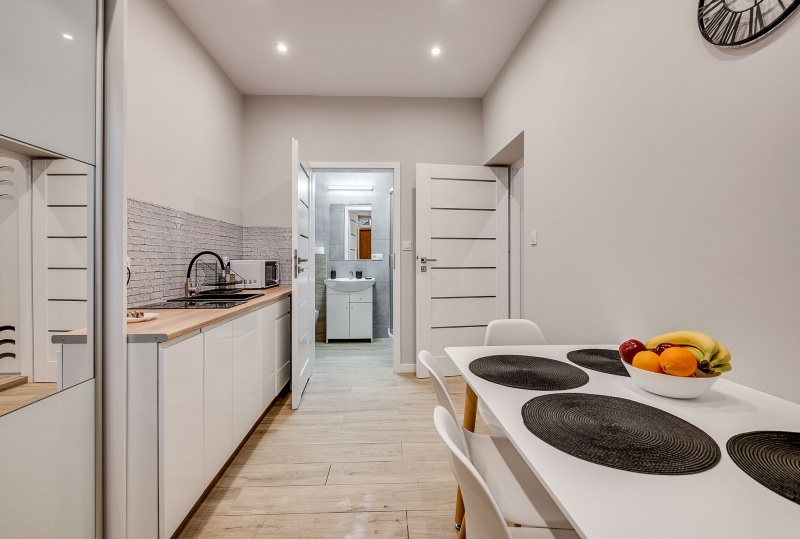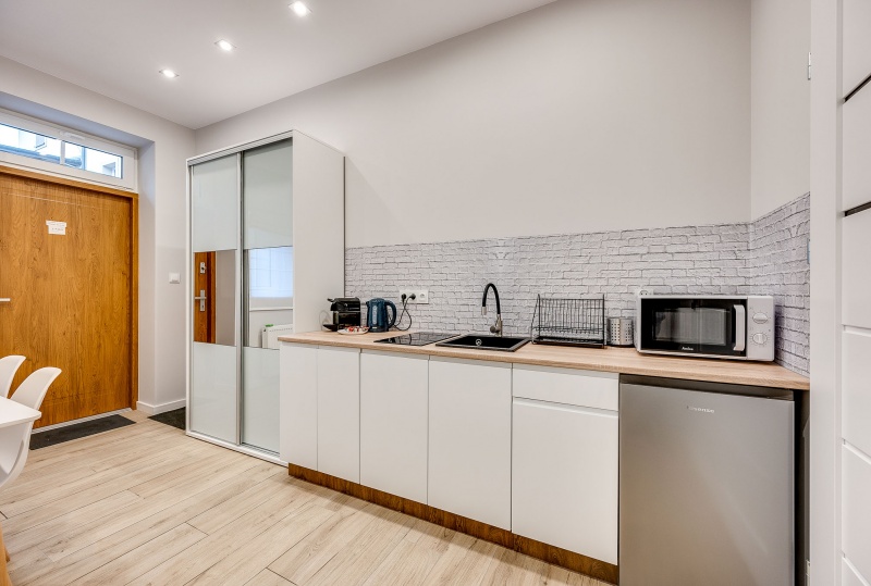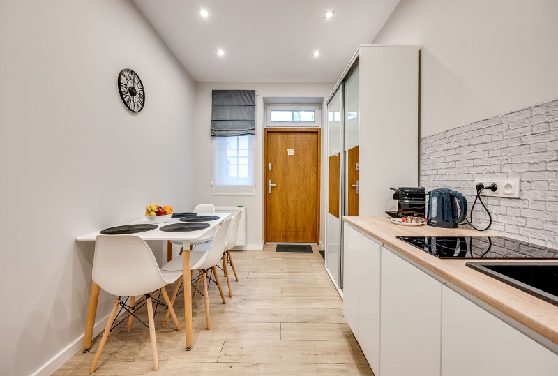 Apartament nr 26 posiada kuchnię wyposażoną w czajnik, płytę grzewczą, kuchenkę mikrofalową oraz lodówkę. W części jadalnianej znajduje się stół dla 4 osób, a przy wejściu znajdziemy przestronną szafę. Kolejnym pomieszczeniem jest salon z rozkładaną sofą dwuosobową, w którym znajduje się także wydzielona część sypialna z dużym łóżkiem dwuosobowym. Apartament posiada również prywatną łazienkę.