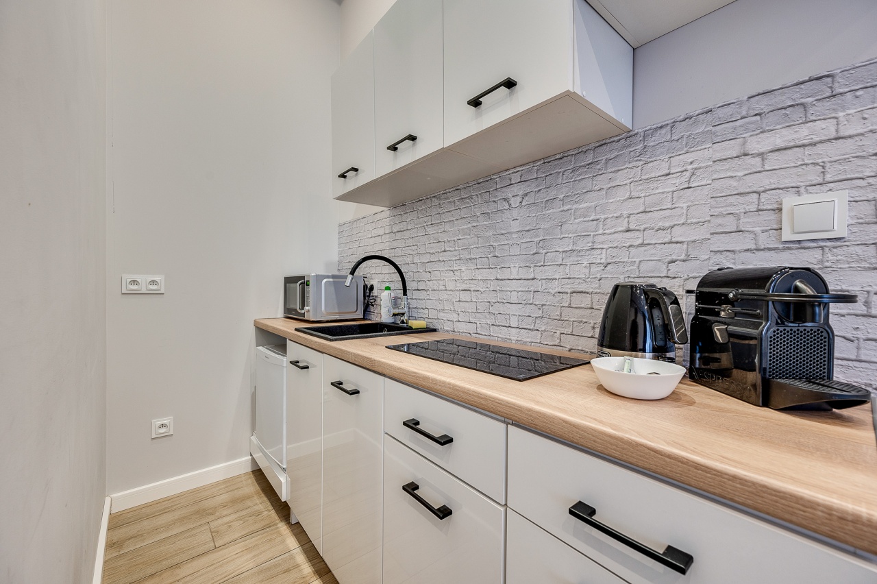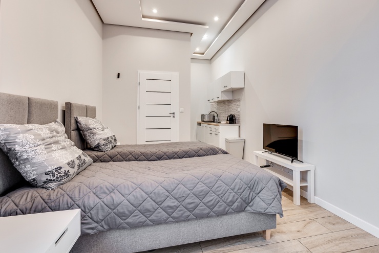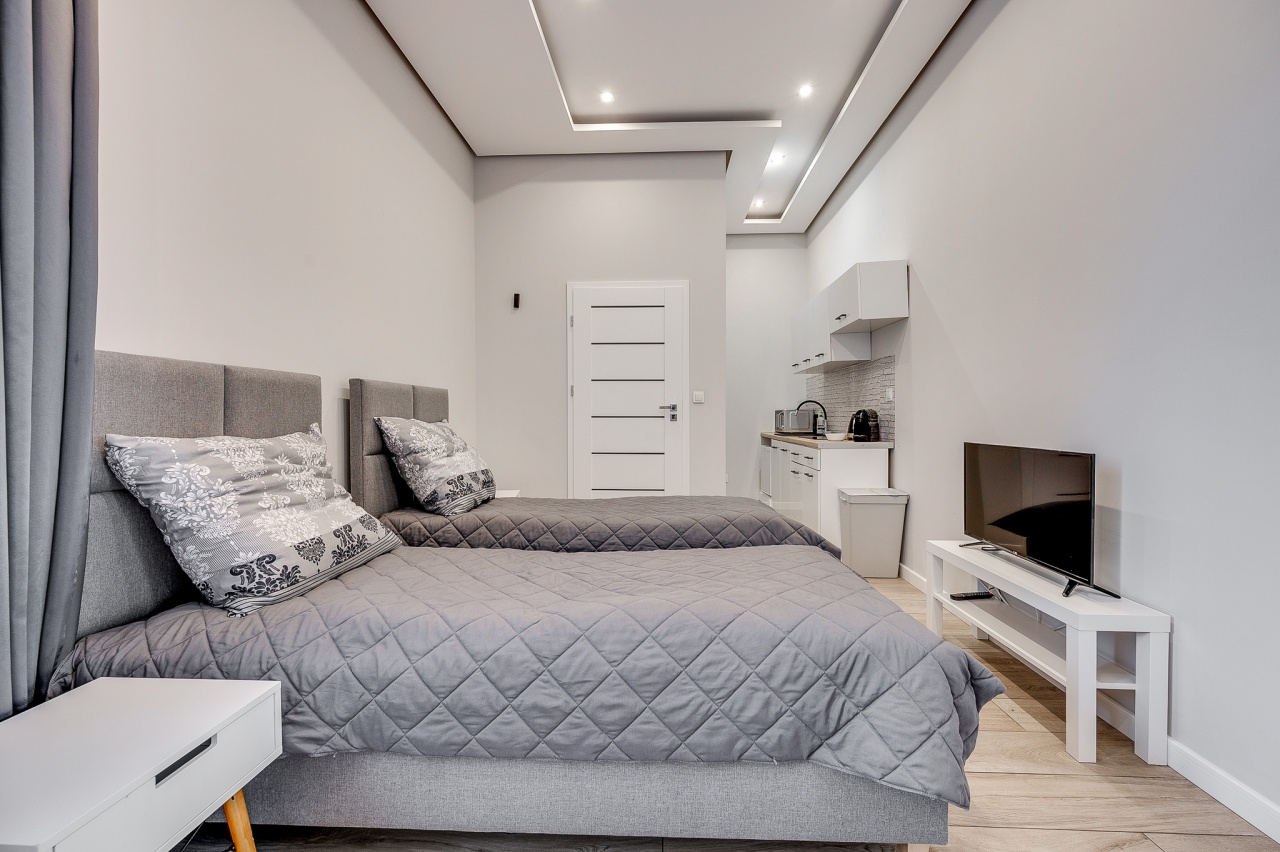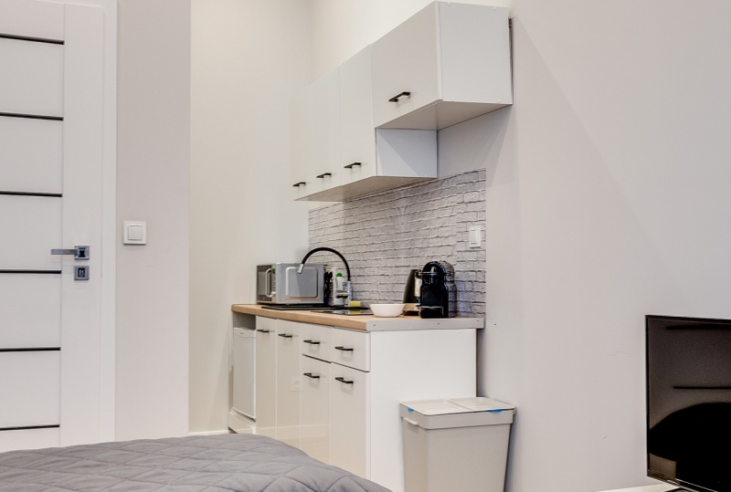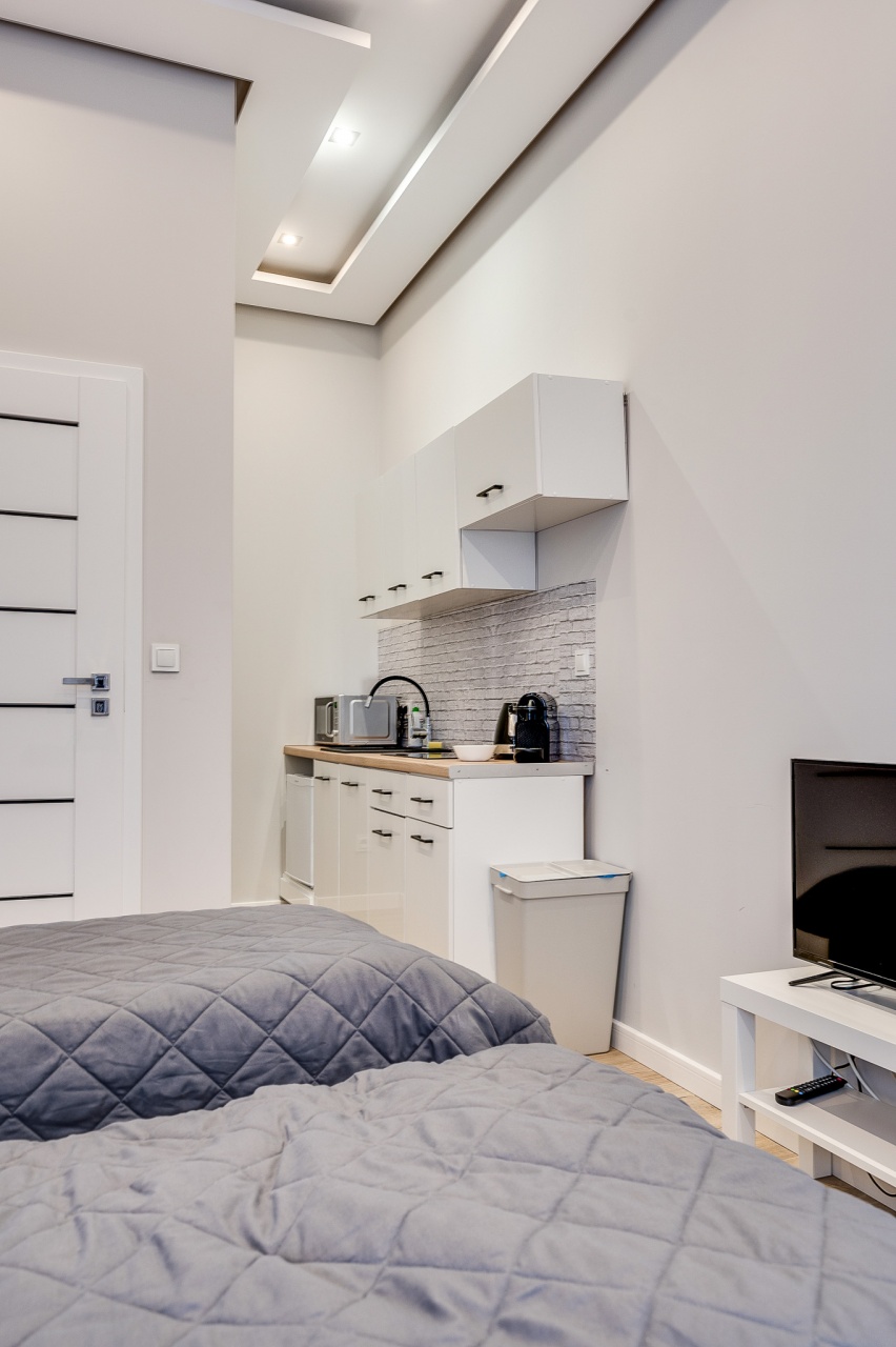 Ten niewielki apartament będzie idealnym miejscem pobytu dla 2 osób. Apartament to wygodna otwarta przestrzeń, w której znajdziemy aneks kuchenny wyposażony w czajnik, kuchenkę mikrofalową, płytę grzewczą i lodówkę, dwa łóżka pojedyncze oraz dużą szafę. Apartament posiada również prywatną łazienkę wyposażoną w pralkę. Do dyspozycji dla  Naszych gości przygotowaliśmy komplet ręczników oraz smaczną kawę na czas pobytu