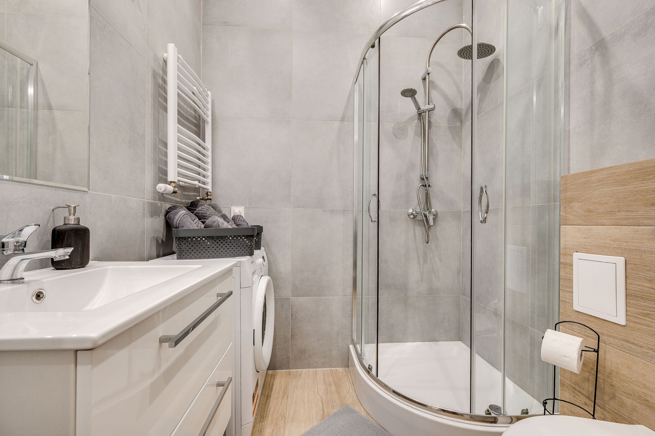 Apartament posiada także prywatną łazienkę wyposażoną w pralkę.