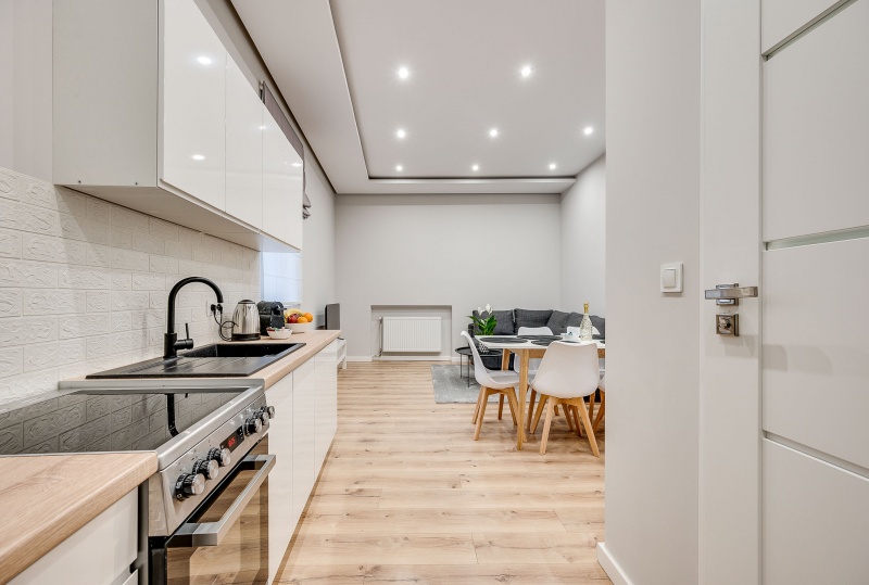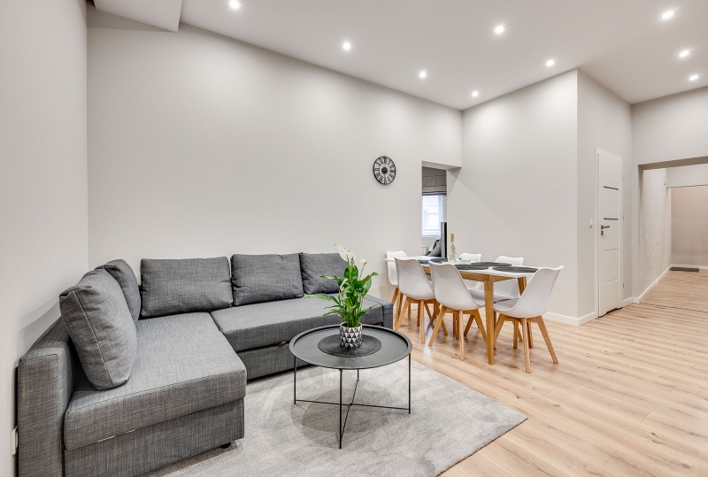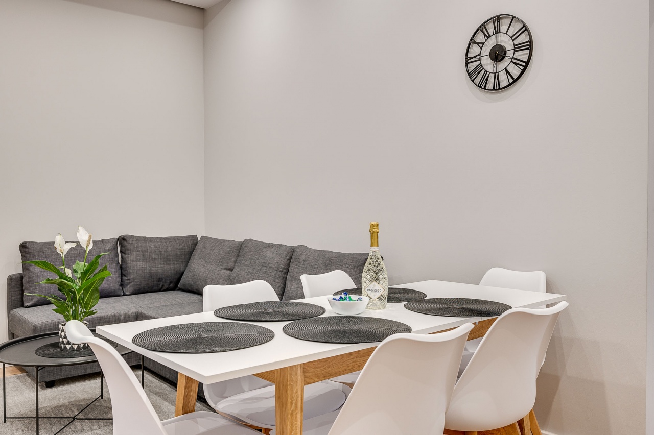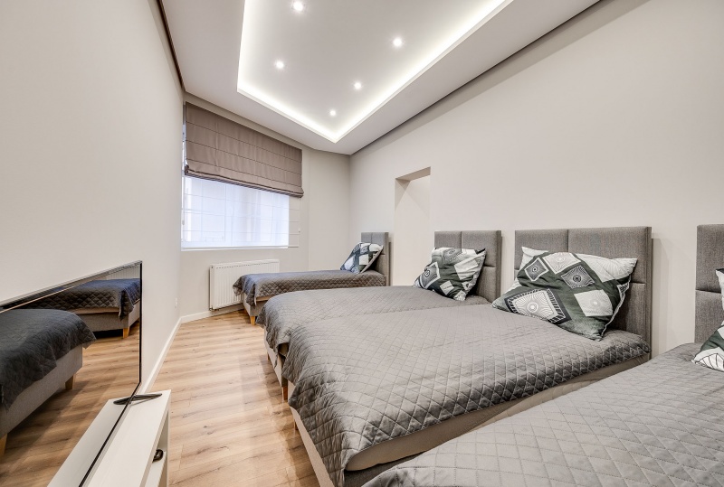 Ten sporych rozmiarów apartament składa się z dużego salonu połączonego z w pełni wyposażonym aneksem kuchennym (czajnik, piekarnik z płytą grzewczą, kuchenka mikrofalowa, duża lodówka) oraz częścią jadalnianą ze stołem dla 6 osób. Znajduje się tam również rozkładana sofa dla 2 osób. W korytarzu znajdziemy dwie przestronne szafy, a w sypialni 4 łóżka pojedyncze oraz dodatkowy telewizor.