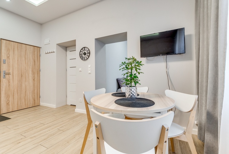 W tym komfortowym i przytulnym apartamencie znajduje się duży salon połączony wraz z aneksem kuchennym w którym znajduje się wszystko co potrzeba ( czajnik, piec wraz z piekarnikiem, kuchenka mikrofalowa lodówka, ekspres do kawy)prywatna łazienka wraz z pralką oraz jedna sypialnia, w której znajduje się podwójne łóżko oraz duża szafa. W salonie rozkładana sofą na której komfortowo odpoczną 2 osoby. Stół jadalniany dla 4 osób