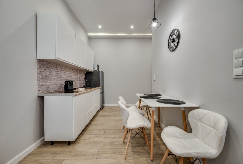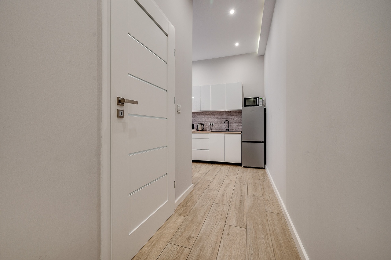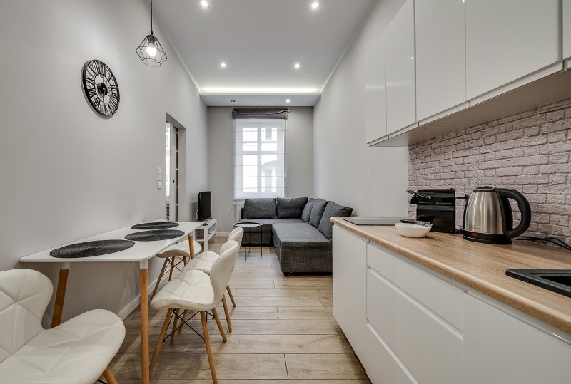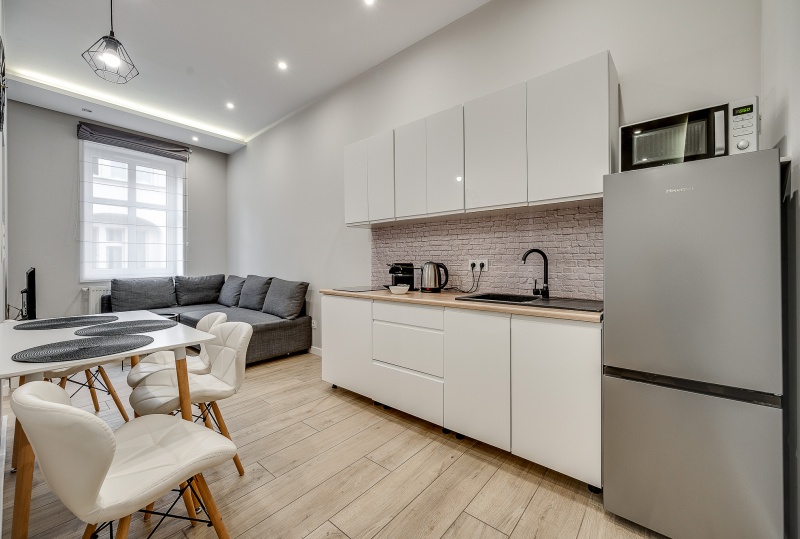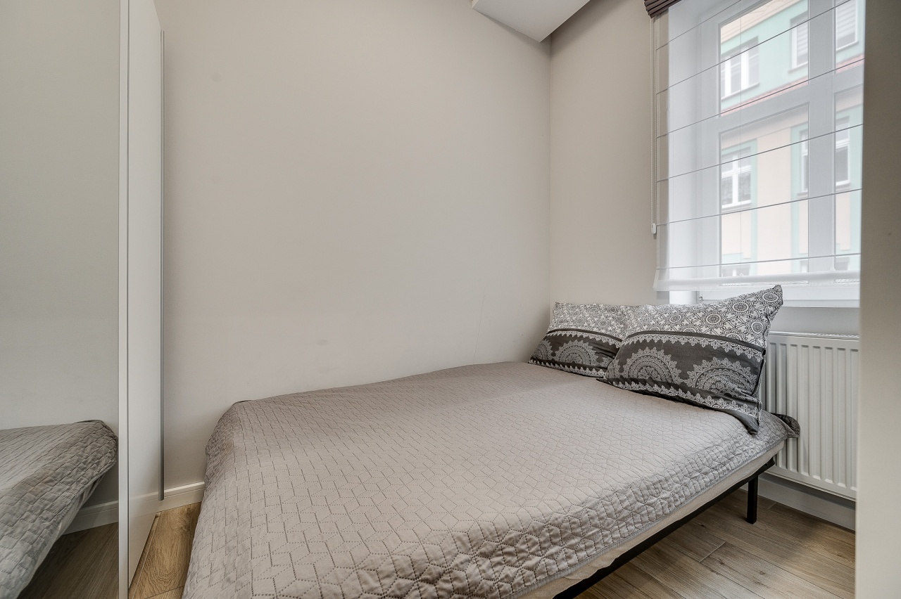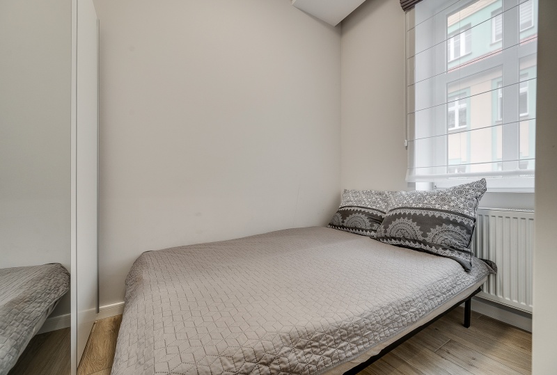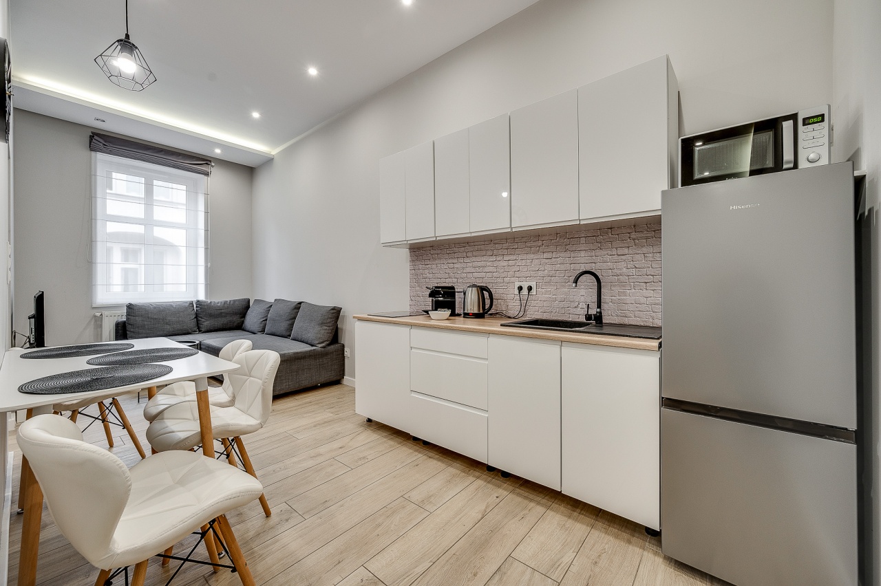 W tym komfortowym i przytulnym apartamencie znajduje się duży salon połączony wraz z aneksem kuchennym w którym znajduje się wszystko co potrzeba ( czajnik, piec wraz z piekarnikiem, kuchenka mikrofalowa lodówka, ekspres do kawy)prywatna łazienka wraz z pralką oraz jedna sypialnia, w której znajduje się podwójne łóżko oraz duża szafa. W salonie rozkładana sofą na której komfortowo odpoczną 2 osoby. Stół jadalniany z krzesłami dla 4 osób